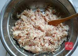 9.把猪肉馅里放入葱姜末,生抽,盐,香油,五香粉和萝卜丝搅拌均匀!